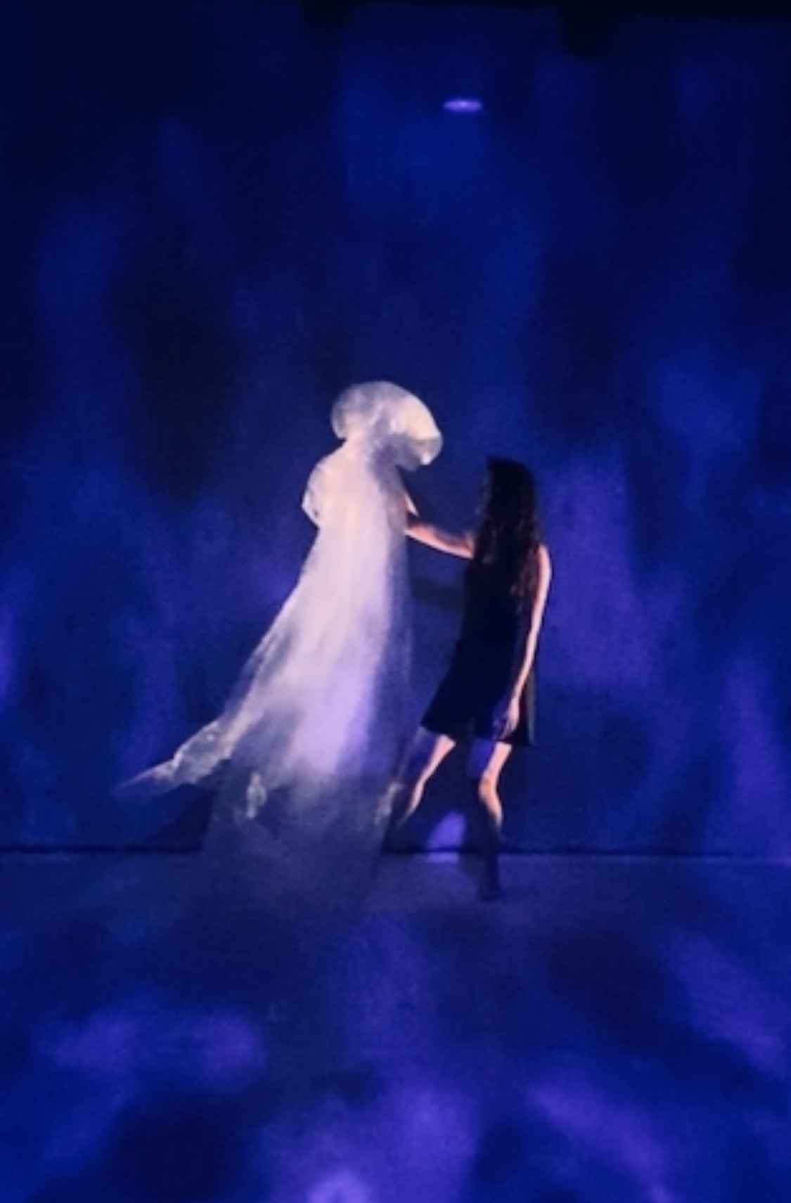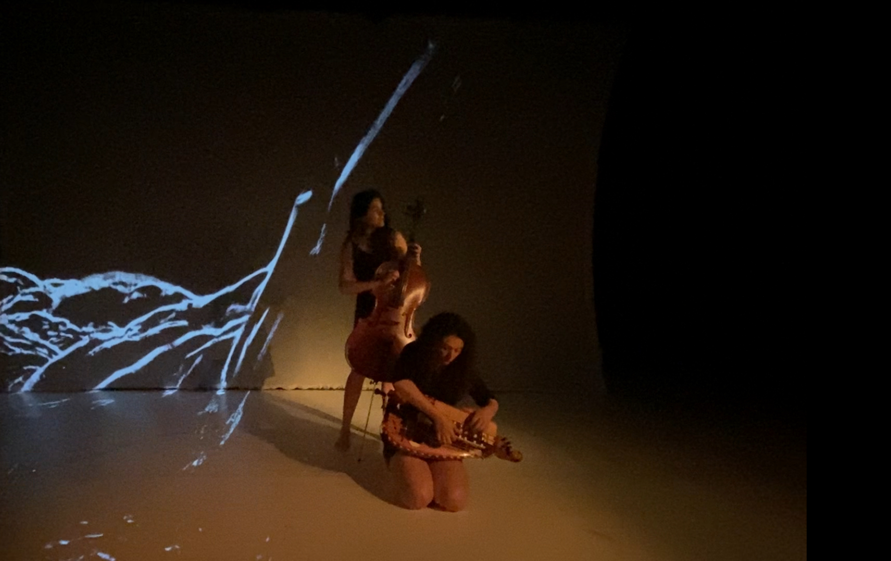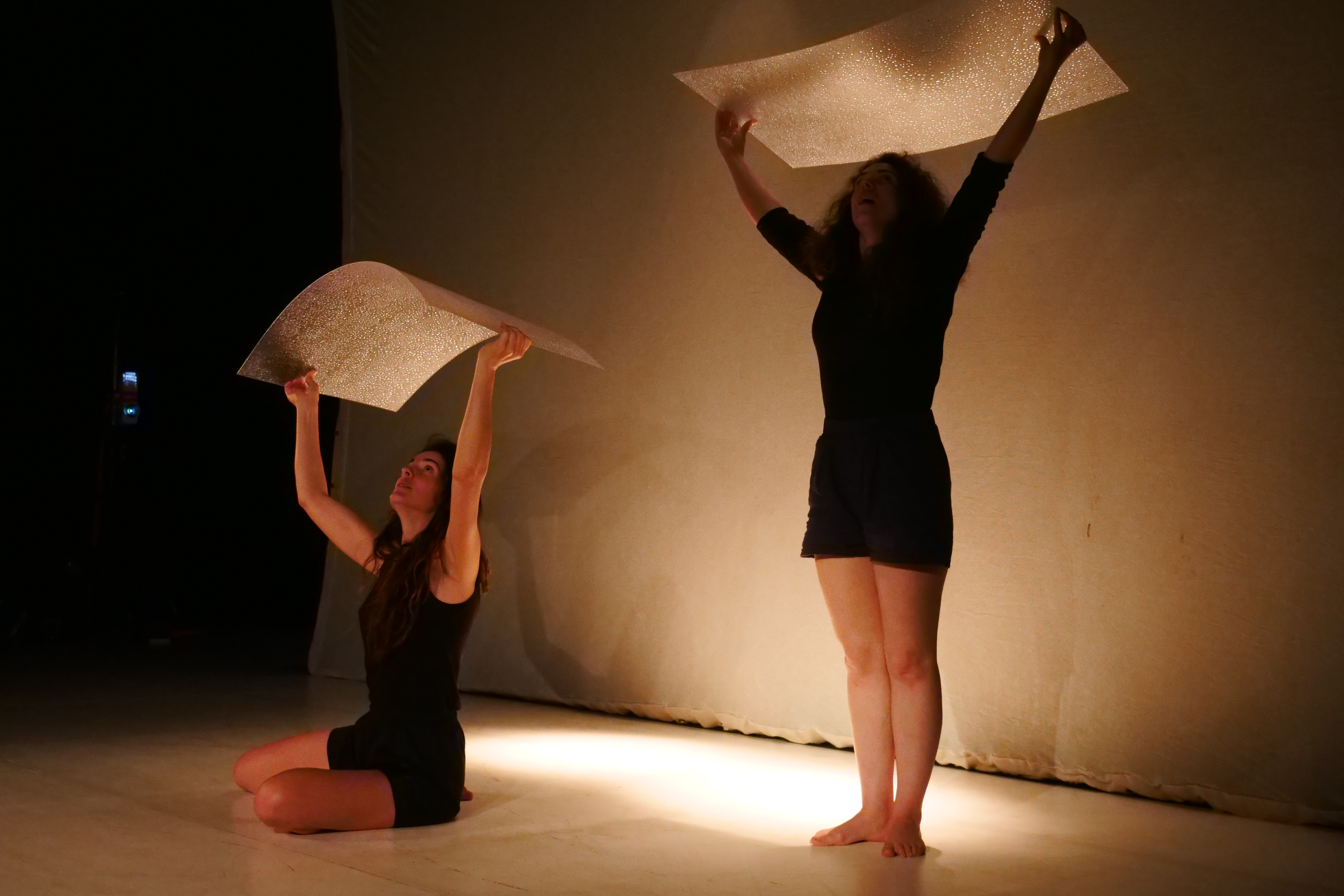 Avec beaucoup de douceur, Sarah Amiel Hassler et Marou Thin, chanteuses et musiciennes, nous emportent au cœur d’un océan imaginaire rempli de créatures sous-marines et de chants fabuleux. Assis auprès d’elles comme dans une petite bulle, en cercle sur la scène du théâtre, nous plongeons dans un univers bleuté où l’harmonie du violoncelle, de la flûte traversière, de la vielle à roue et des voix se fait l’écho de la poésie visuelle du spectacle. Vidéos, plexiglas, entrelacs de tissus et de tulle jouent avec la transparence pour nous faire voyager aussi bien sous la mer qu’à sa surface.