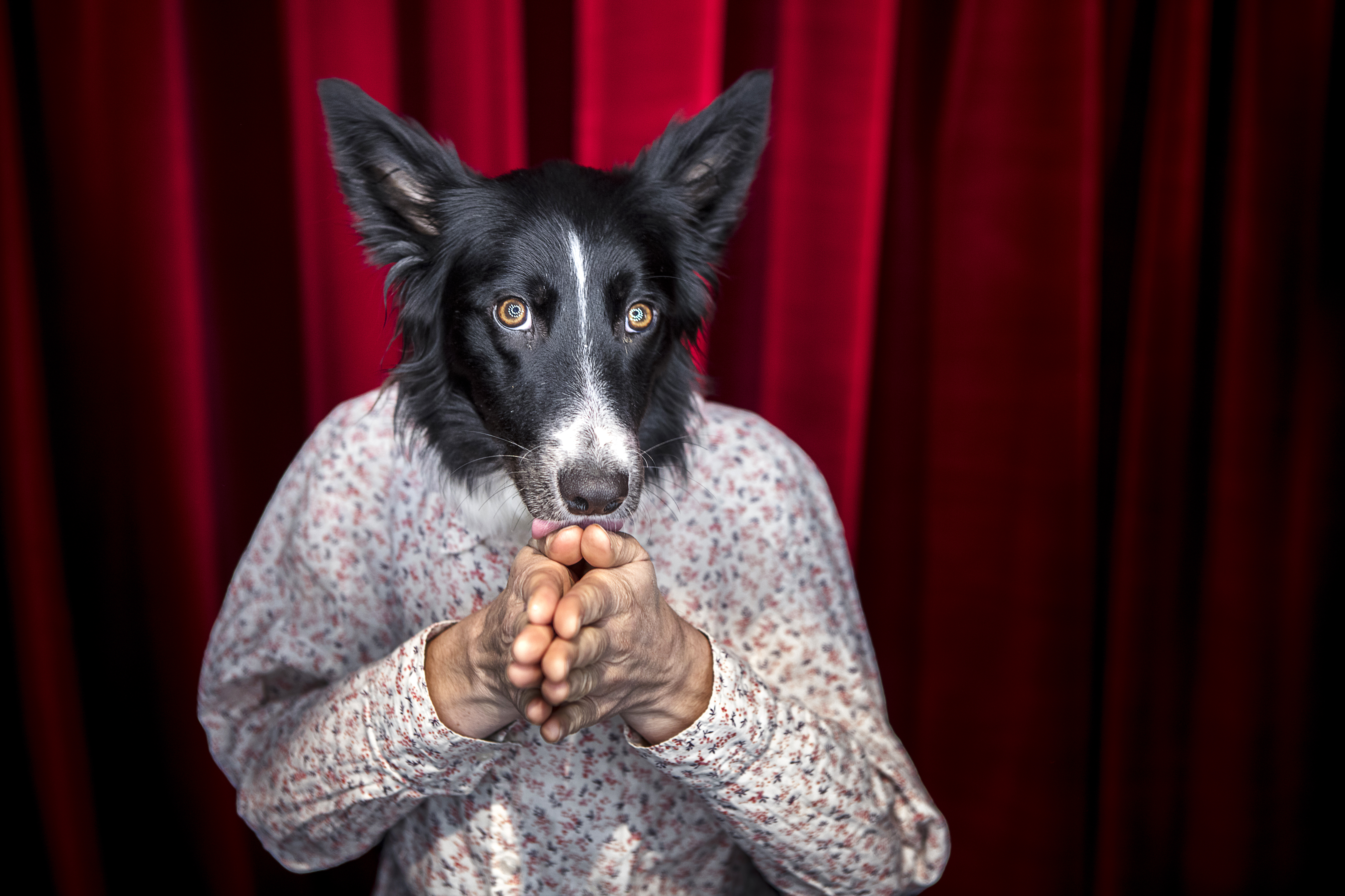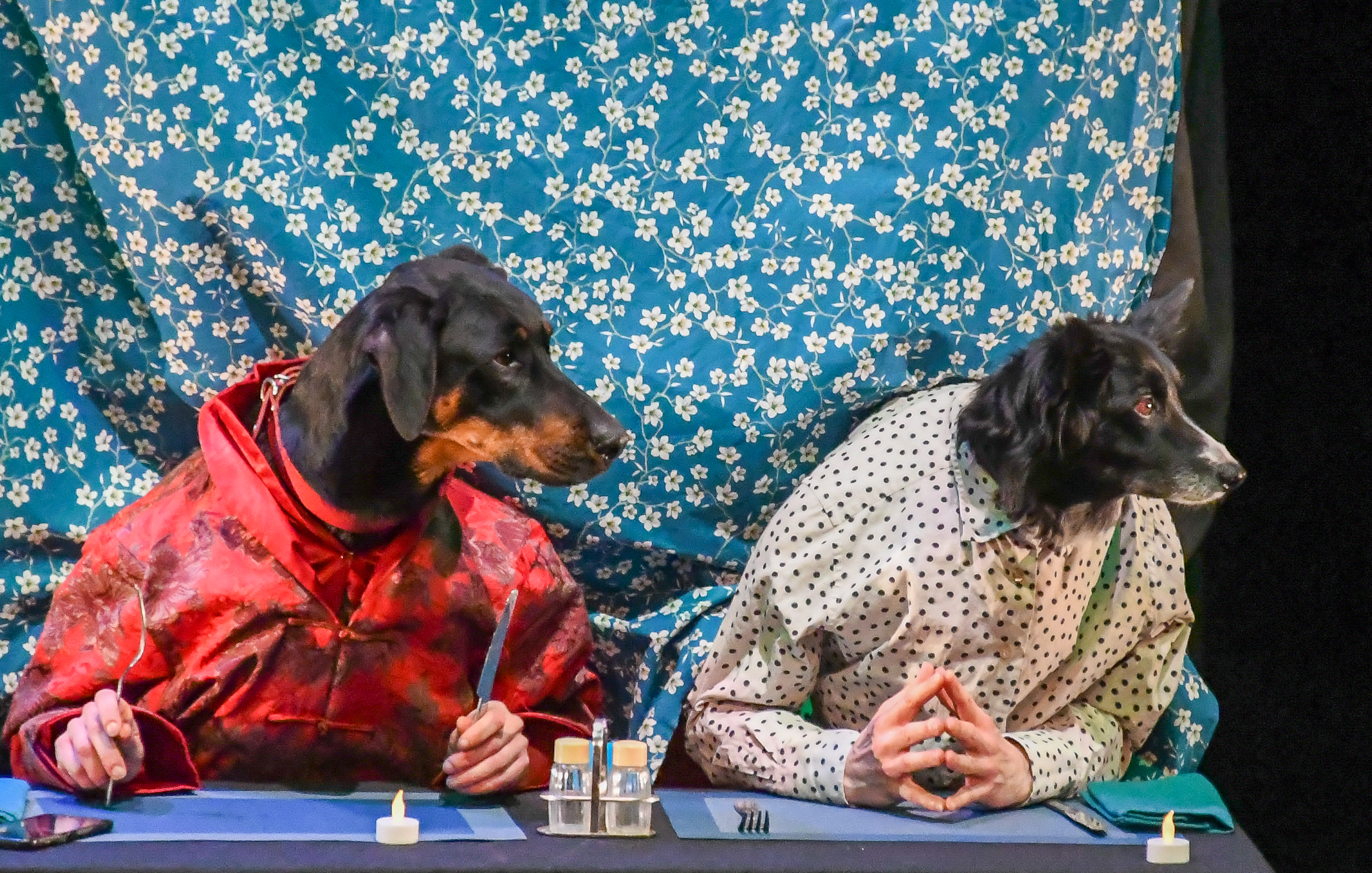Tina, Paulette, Boby, Alba et Woody ont enfilé leurs plus belles tenues pour ce dîner au restaurant. Ils dégustent les mets servis avec plus ou moins d’élégance. Rouspètent après la musique. Ou le serveur. Jusque-là rien d’anormal. Sauf que ces convives un peu spéciaux ne sont autres... que des chiens ! Ou plutôt, cinq duos hommes-canidés : entre lancers de saucisses, balades romantiques, effeuillage canin et imprévus en tous genres, un véritable show clownesque se déploie sous nos yeux. La succession savante de saynètes comiques déroule un univers surprenant qui met en lumière la complicité joyeuse et contagieuse de ces supers stars branchées à l’instinct. Le tout en musique live. Du Jamais vu !