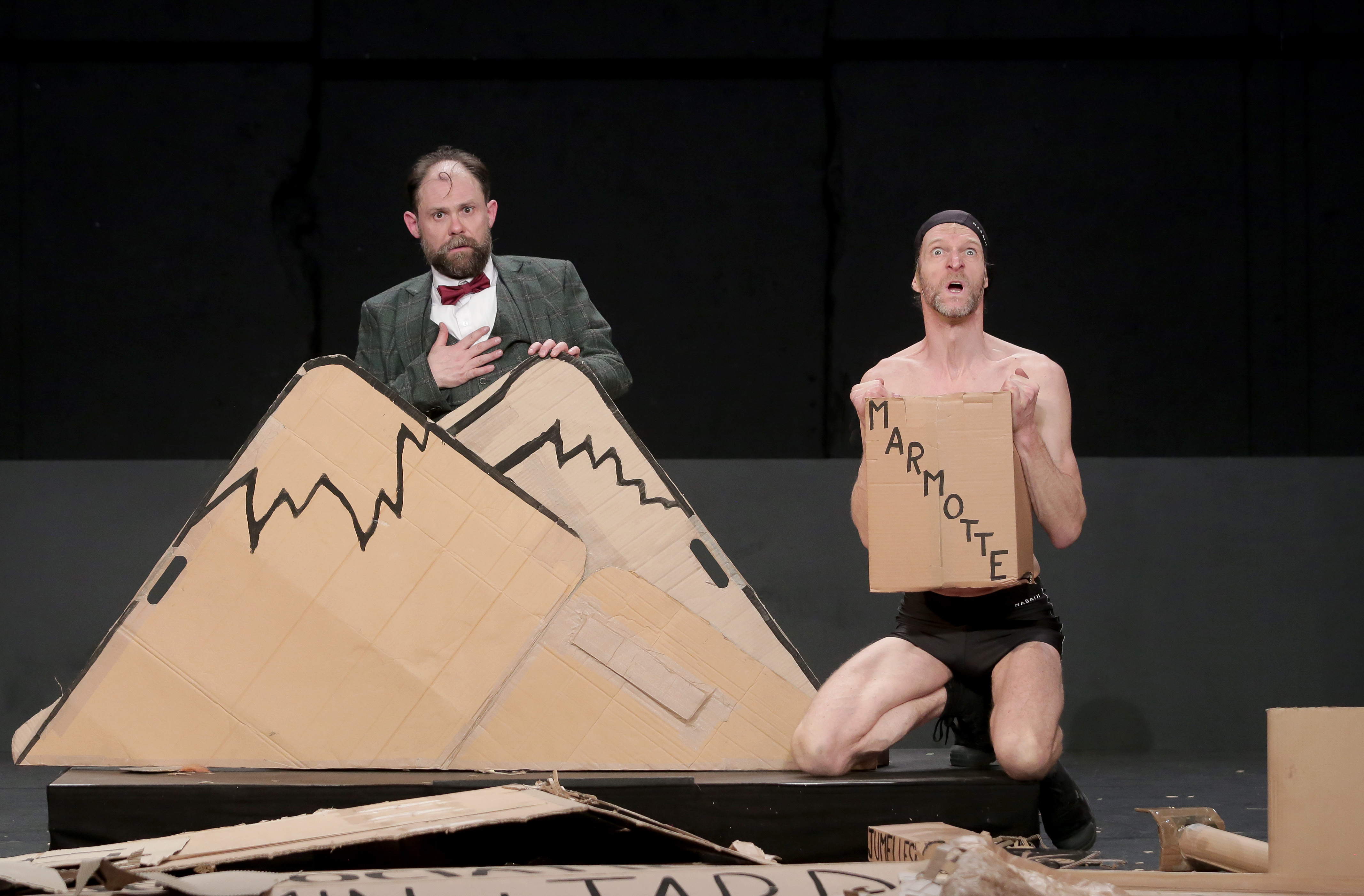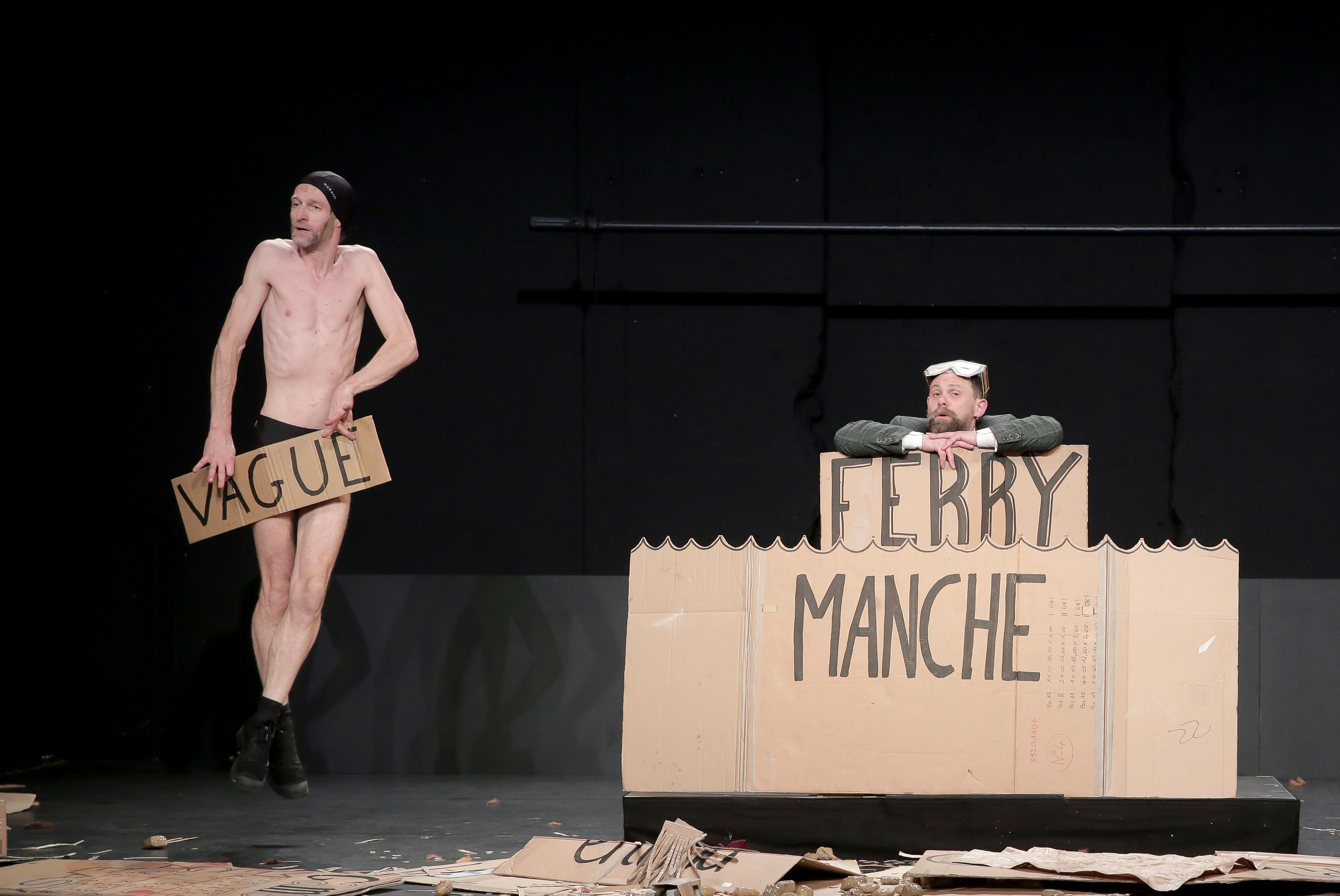Dans un feu d’artifice de bouts de carton, ils nous invitent à un voyage imaginaire, fusion des délires d’un cabaret de « cartoons » et d’une épopée shakespearienne. Dans une langue « très angliche », un acteur imposant raconte son histoire incroyable. Maudit par une sirène pêchée par accident, il quitte les plaines du Grand Nord, s’évade en patins, à trottinette, en avion cartonné. Il découvre l’Écosse, repart vers le sud à dos de mulet, assassine quelques cornemuseurs au passage, cherche l’amour, toujours. Mais l’acteur en costume trois pièces reste assis, c’est la folie du spectacle. Son acolyte en maillot de bain traverse le plateau de droite à gauche et gesticule des myriades de cartons en guise de sous-titres, où sont inscrits noms des pays, accessoires ou bestioles rencontrées. Aventures rocambolesques déployées à force d’astuces et de gags, c’est une explosion d’idées géniales et farfelues à la Tex Avery. Un cabaret de carton pour déployer la délirante aventure d’un voyage immobile.