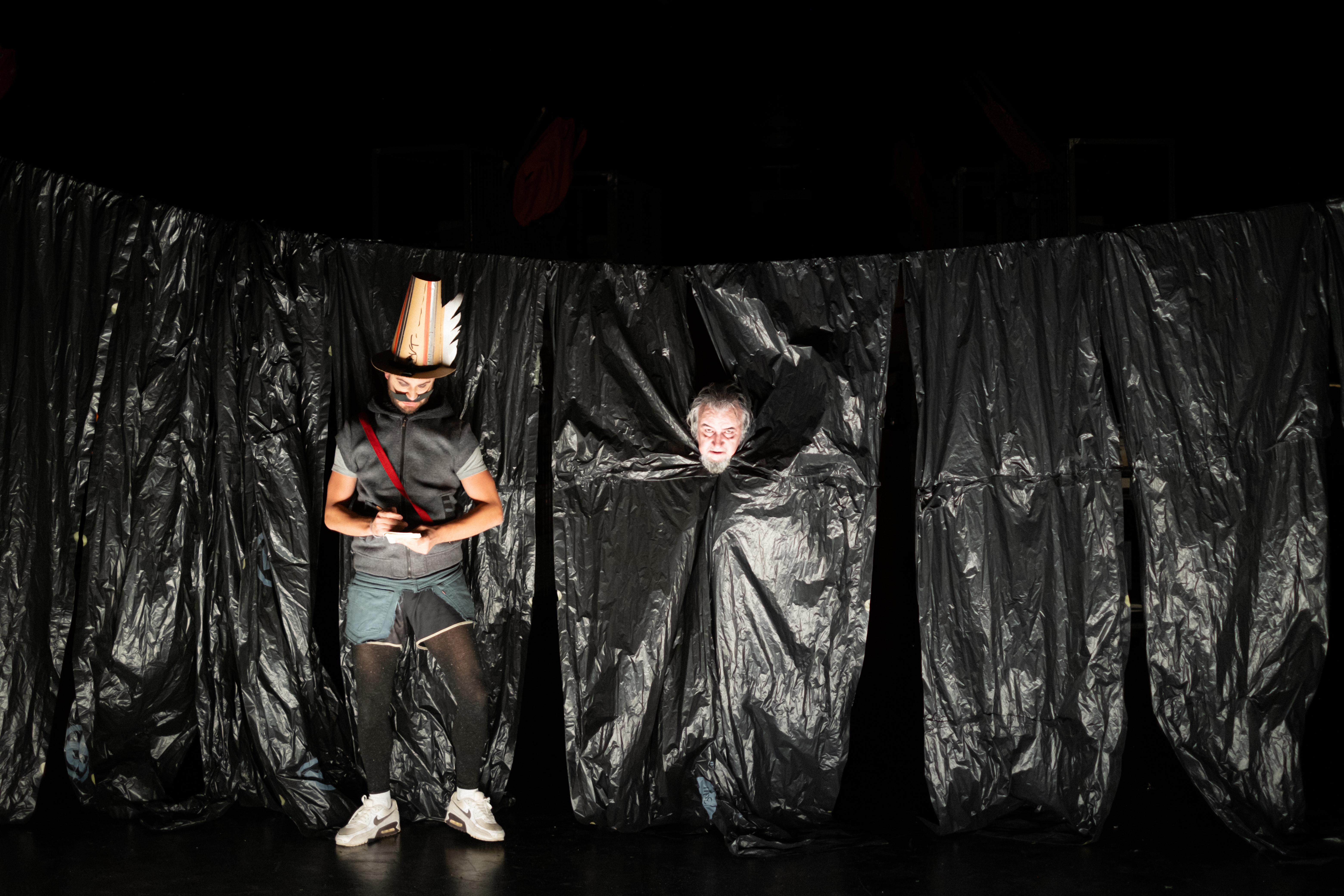 Bousculer nos imaginaires créatifs, d’un tissu découpé à la va-vite en faire une perruque, s’imiscer discrètement (ou non) dans l’action pour créer la silhouette d’un visage contouré de post-it, d’une serpillère créer un turban, de cartonnages des anglaises... Découper, scotcher, coller, réduire en poudre, peinturlurer, agrapher... En un mot (ou presque) : jouer tout en rêvant à nos « fantômes de papier » que sont ces personnages de théâtre..."